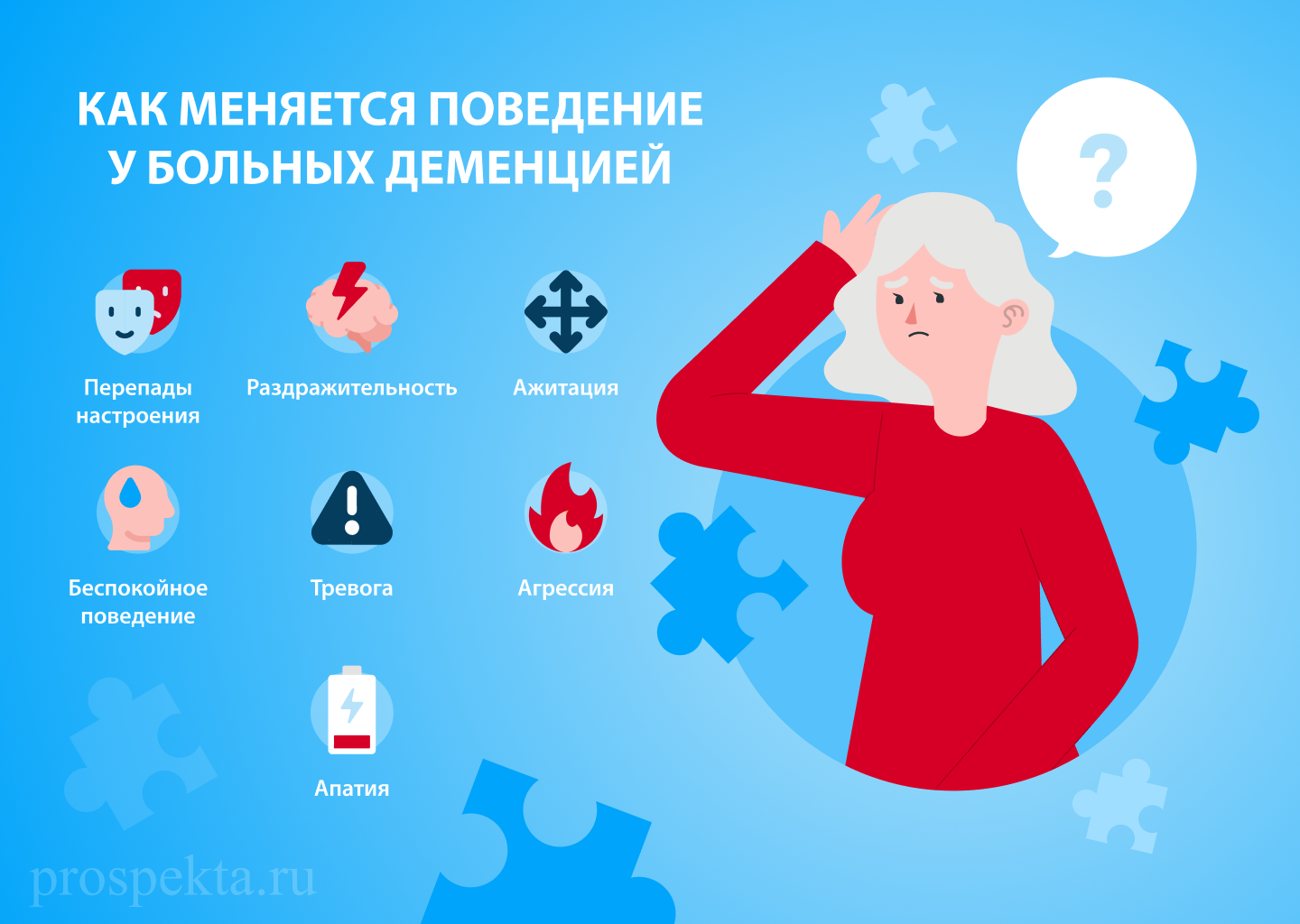 Деменция — это термин, объединяющий несколько заболеваний, которые ухудшают память, мышление и способность человека нормально вести повседневную жизнь. Она поражает в основном пожилых людей. При ней у человека часто наблюдаются осложнения в виде приступов агрессии, постоянного движения, намеренного повреждения вещей или мебели.