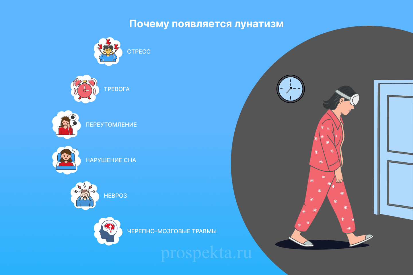 У детей лунатизм связан с функциональной незрелостью мозговых структур, а у пожилых — с возрастными сосудистыми и/или дегенеративными изменениями в мозге. Иногда сомнамбулизм обусловлен грубыми необратимыми изменениями головного мозга при эпилепсии, опухолях мозга, последствиях черепно-мозговых травм. Но эти случаи редки. Чаще всего патология носит функциональный, обратимый, характер и от нее можно избавиться.