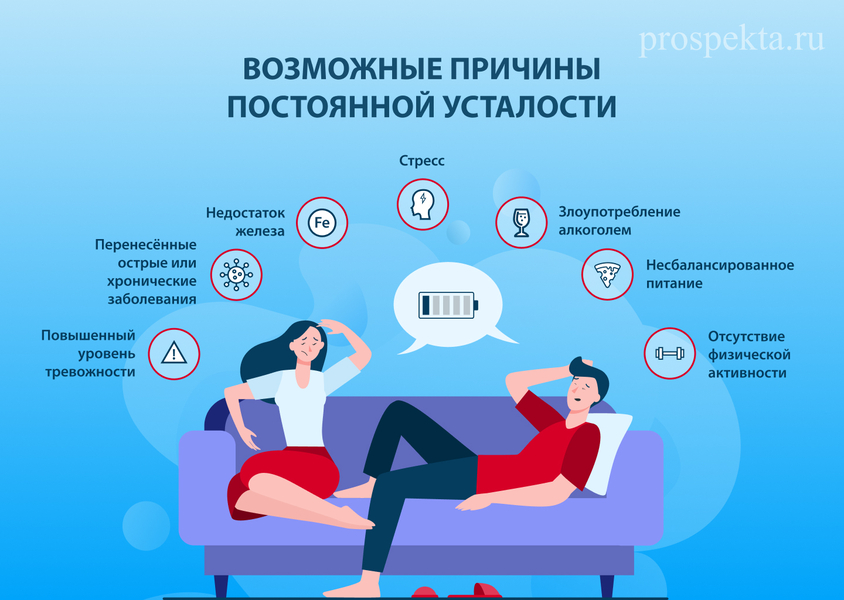 Отдельно хотелось бы выделить синдром хронической усталости – состояние, при котором переутомление сохраняется дольше полугода, но объективных причин для этого нет. Люди с таким синдромом не заняты тяжелым физическим трудом и не страдают хроническими болезнями, но усталость сопровождает их всегда. Подробнее о синдроме хронической усталости — в нашей статье: https://prospekta.ru/stati/sindrom-xronicheskoj-ustalosti